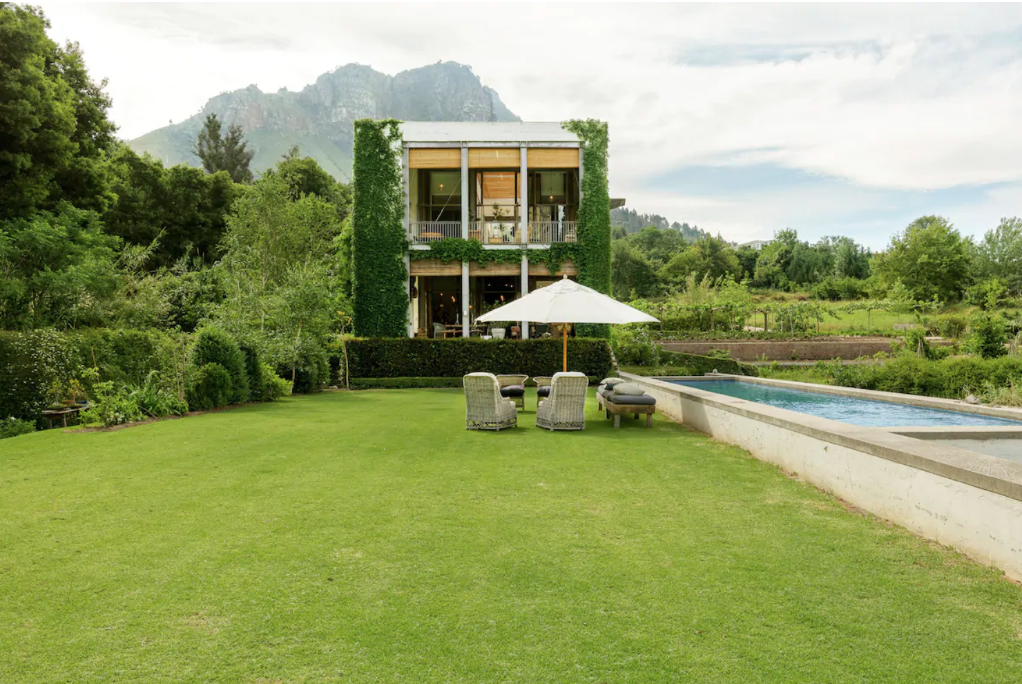 The ceremony can take place by the pool, patio, manicured lawn, or under the maple tree at the front entrance. Completely private and secluded there are majestic mountain views and fragrant fresh flowers growing in the surrounding farmland. Enjoy vineyards, fruit orchards, and a convenient 45min drive to the cape town international airport. Book your intimate overseas destination elopement in Modern Home, Stellenbosch, South Africa, and get excited!